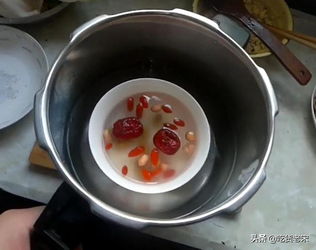 4、放入冰糖、狗枸和适量的水。(注意:内部填充一半就可以,不要装得太满。)